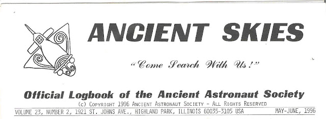 Cabecera de la portada del número 2 del volumen 23 (mayo-junio 1.996) de la publicación Ancient Skies de la Ancient Astronaut Society, donde tuve por primera vez noticias sobre la existencia de la Nave de Toprakkale.